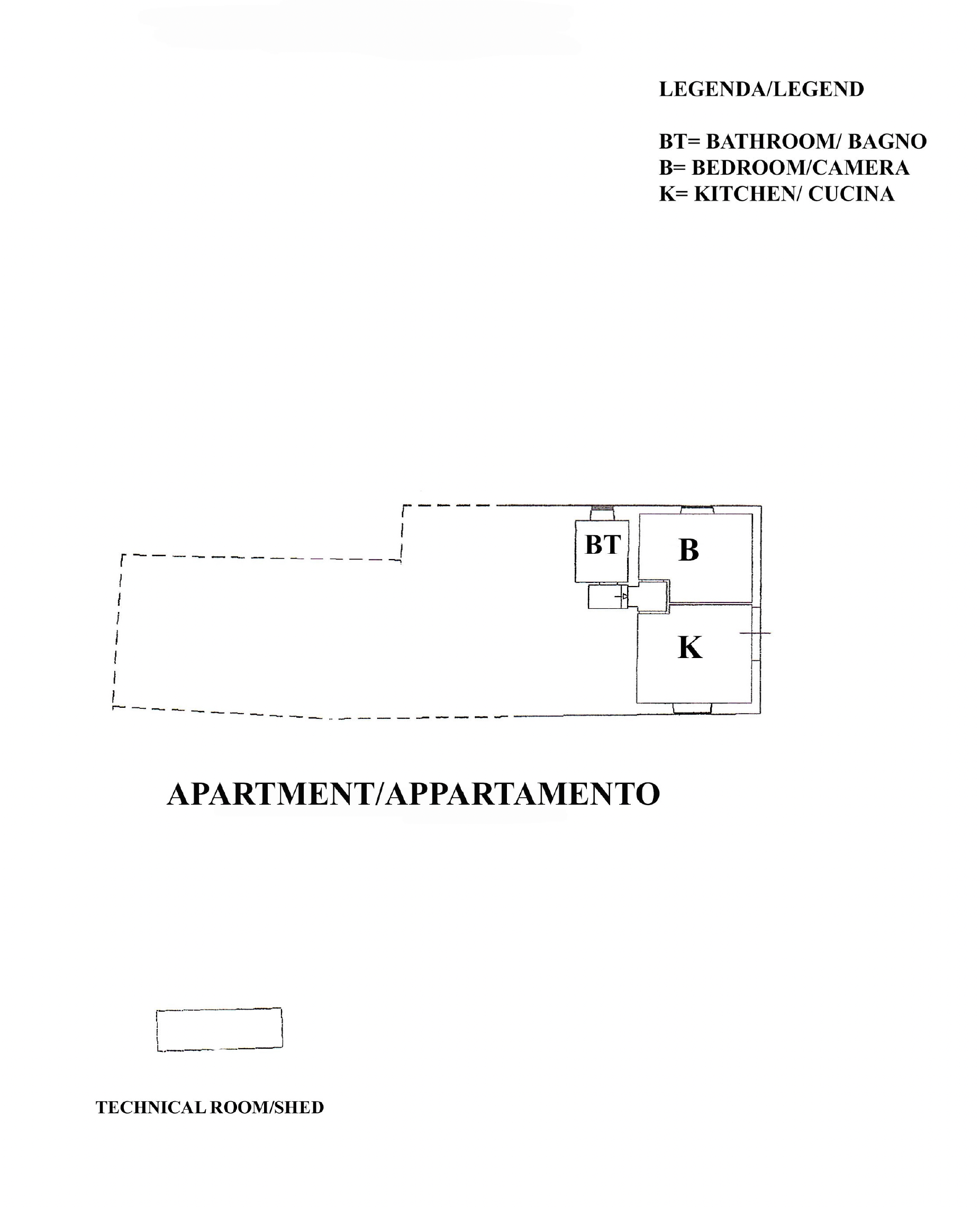 The apartment located on the ground floor consists of a kitchen/living room with fireplace, bedroom and bathroom.