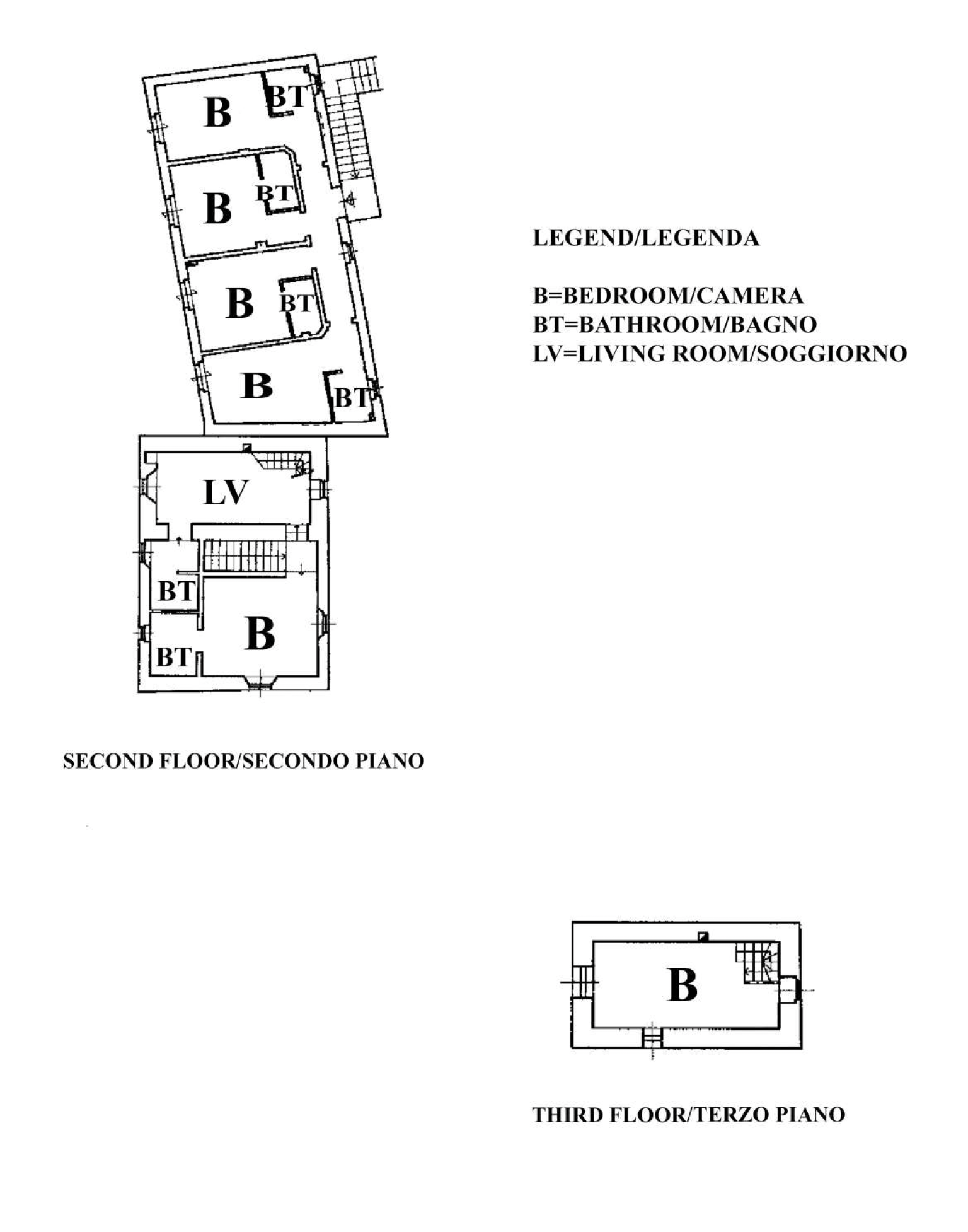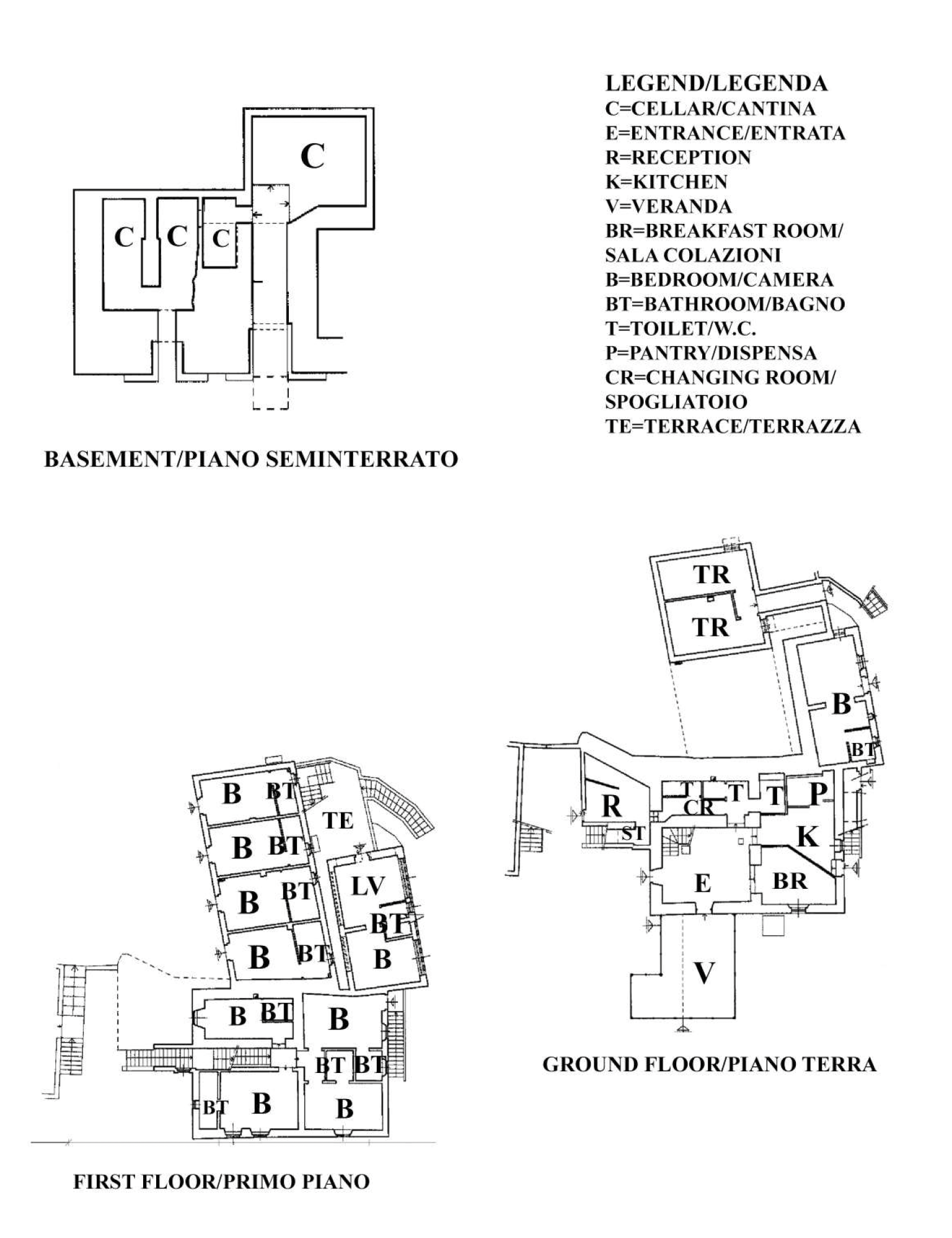 The ground floor hosts the reception area, a professional kitchen with pantry, the breakfast room/restaurant with a large veranda, a guest restroom, an independent bedroom with private bathroom, a staff changing room with dedicated facilities, and the technical rooms serving the hotel.