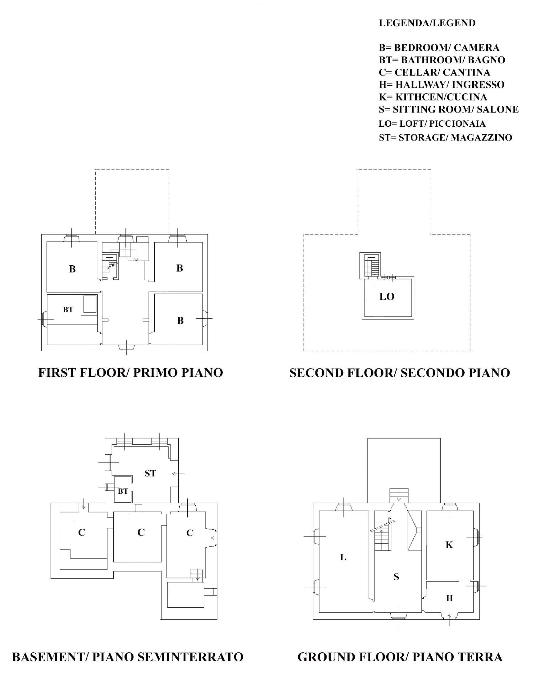 A piano terra è composta da un ampio salotto con camino e terrazzo e cucina. Salendo a piano primo troviamo la zona notte formata da tre camere da letto, bagno di servizio e accesso alla piccionaia.