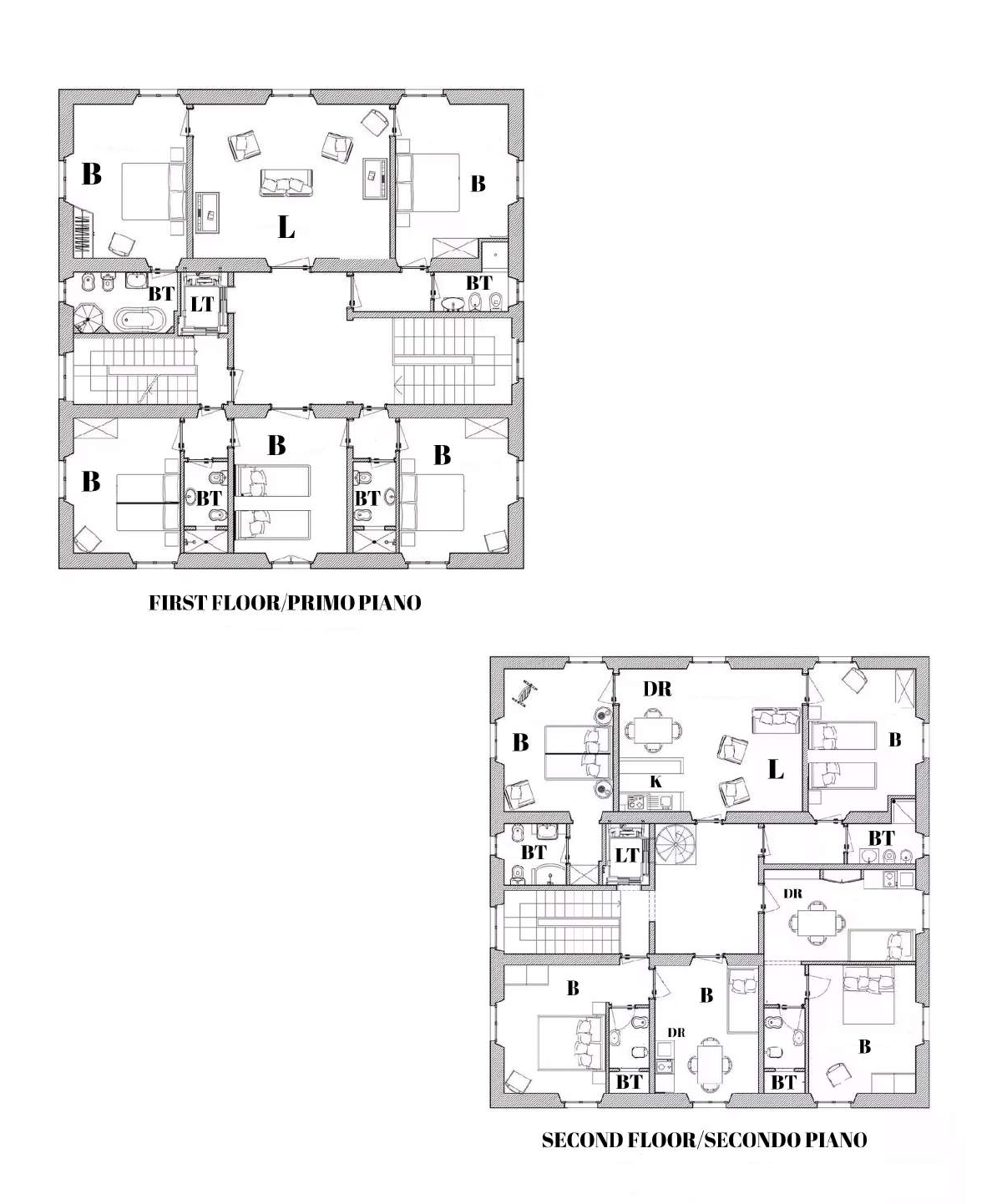Il primo piano accoglie la zona notte, composta da cinque camere da letto e quattro bagni, tutte collegate da un disimpegno centrale in cui arrivano sia la scala principale che l’ascensore.