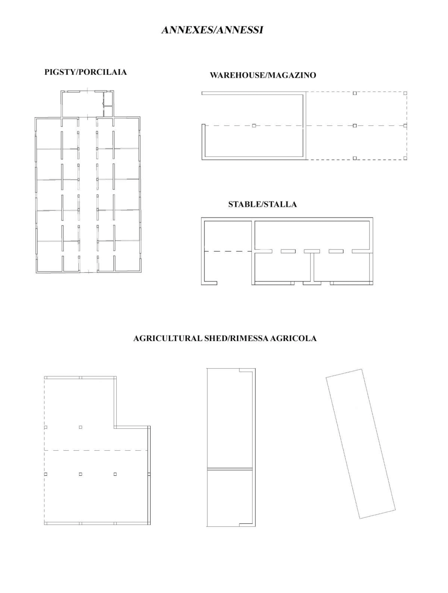 La proprietà include diverse strutture secondarie tra cui stalle, rimesse e un’antica porcilaia che contribuiscono a formare una superficie coperta complessiva superiore ai 1600 mq.