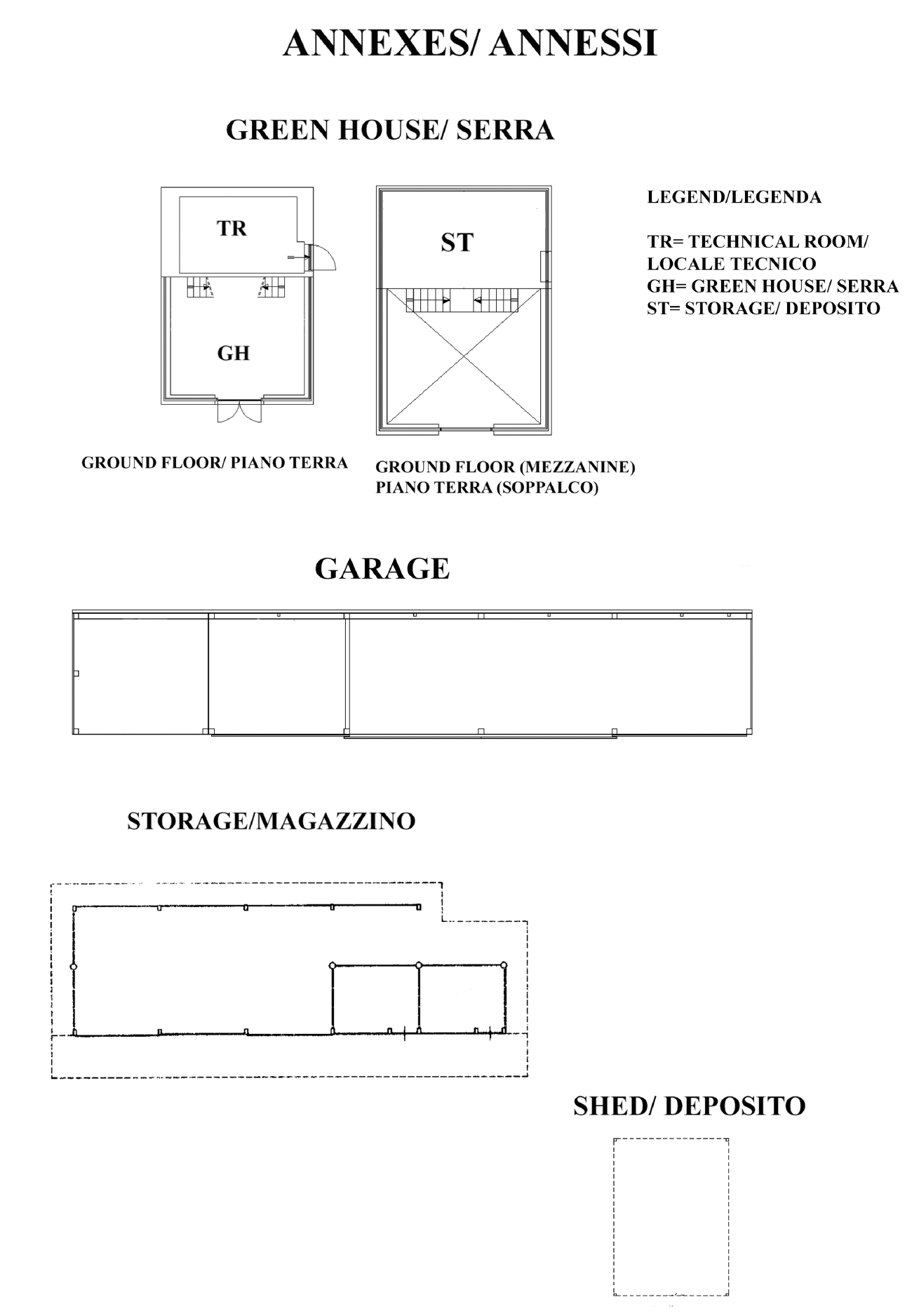 La proprietà comprende anche una serra di 110 mq con locale tecnico, attualmente utilizzata come deposito per le attrezzature della piscina e del giardino. Sono inoltre presenti un garage di 115 mq con aperture automatiche, una scuderia/magazzino di 110 mq e un deposito di 26 mq.