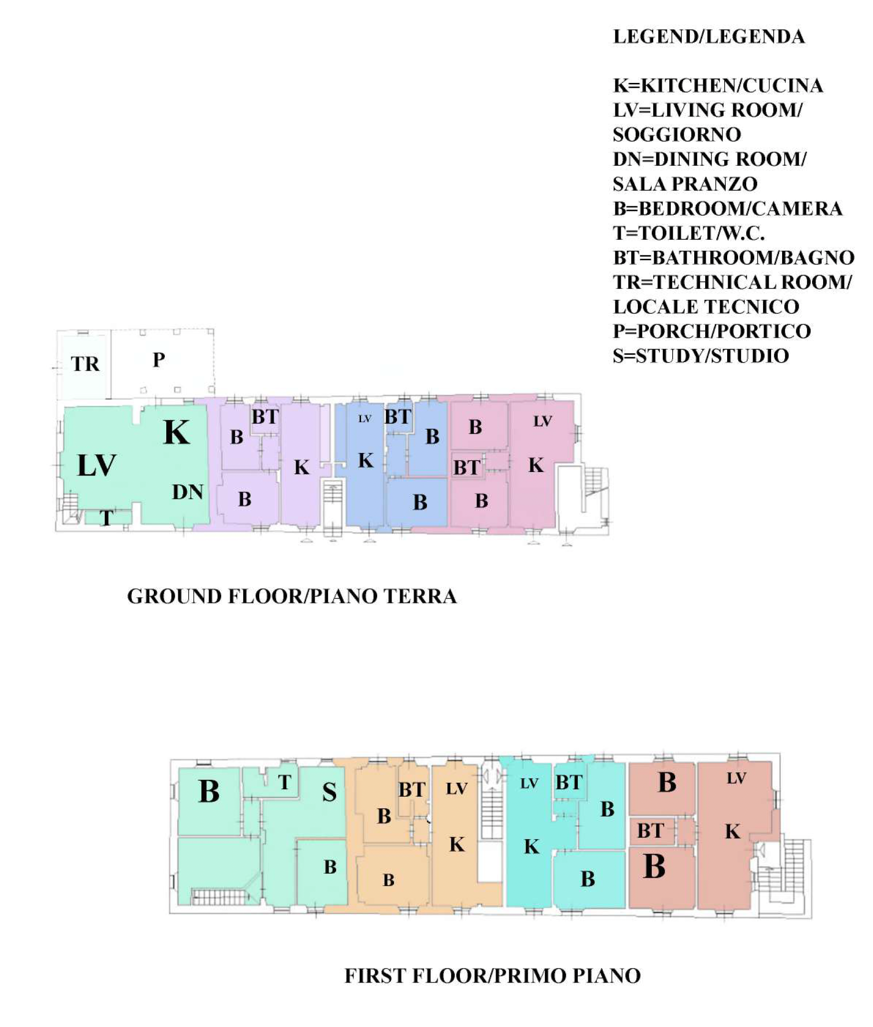 Il settimo appartamento, distribuito su due piani, presenta al piano terra una luminosa zona giorno con cucina e soggiorno, oltre a un bagno; al primo piano si trovano tre camere, una delle quali adibita a studio, e un ulteriore bagno. Completa la proprietà un piacevole porticato al piano terra, ideale per rilassarsi all’aperto.