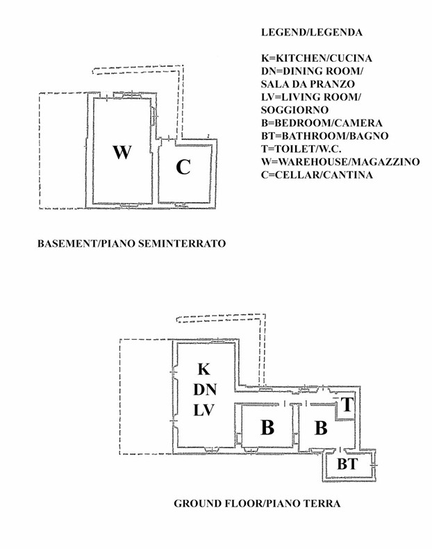 Il casale principale si sviluppa su due livelli: al piano seminterrato sono presenti ampi locali adibiti a magazzino e a cantina, mentre al piano terra si apre la zona abitativa con ingresso, bagno, due camere da letto di cui una con bagno privato, e una luminosa area living che unisce soggiorno, cucina e zona pranzo, affacciata sul verde.