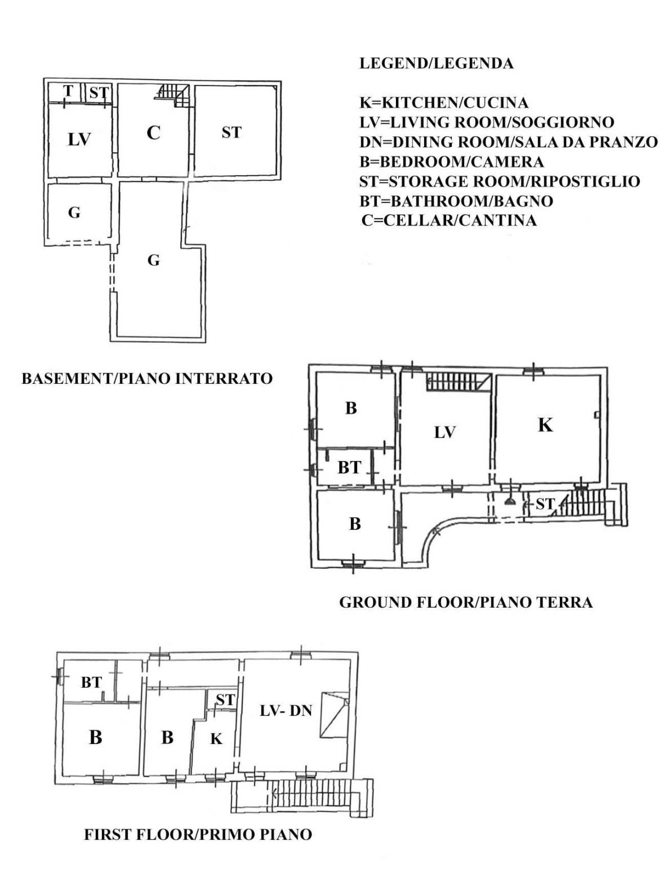 Il casale in pietra, di circa 300 mq, si sviluppa su tre piani come segue: