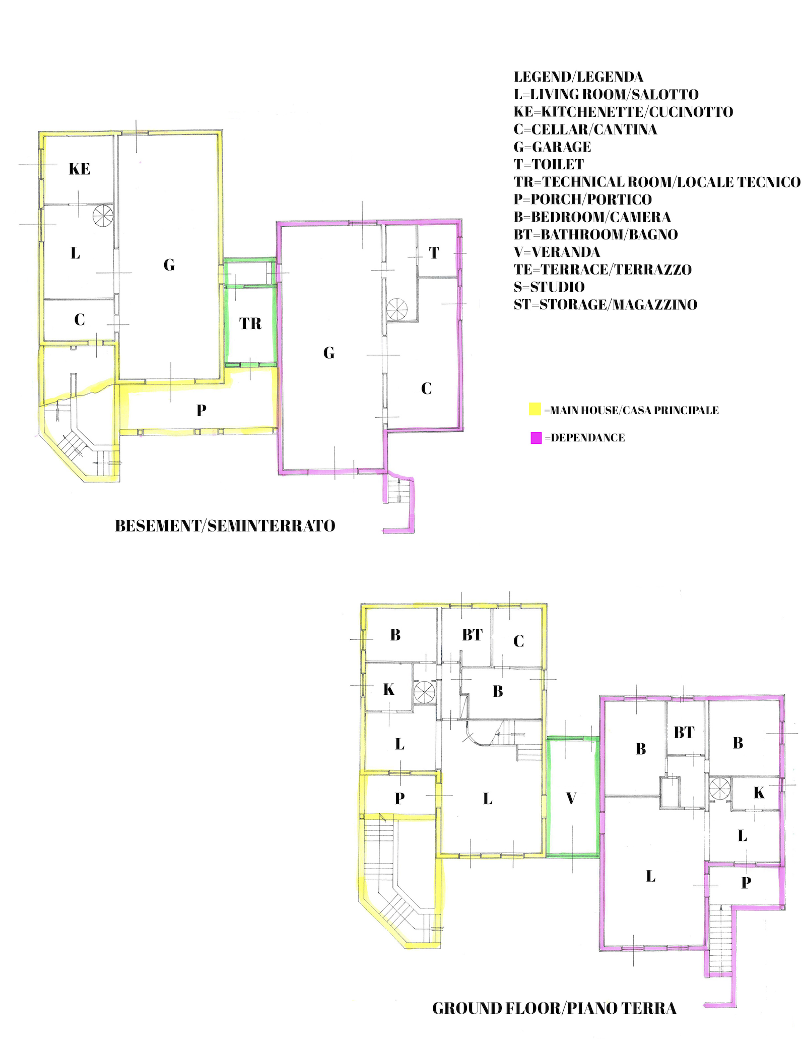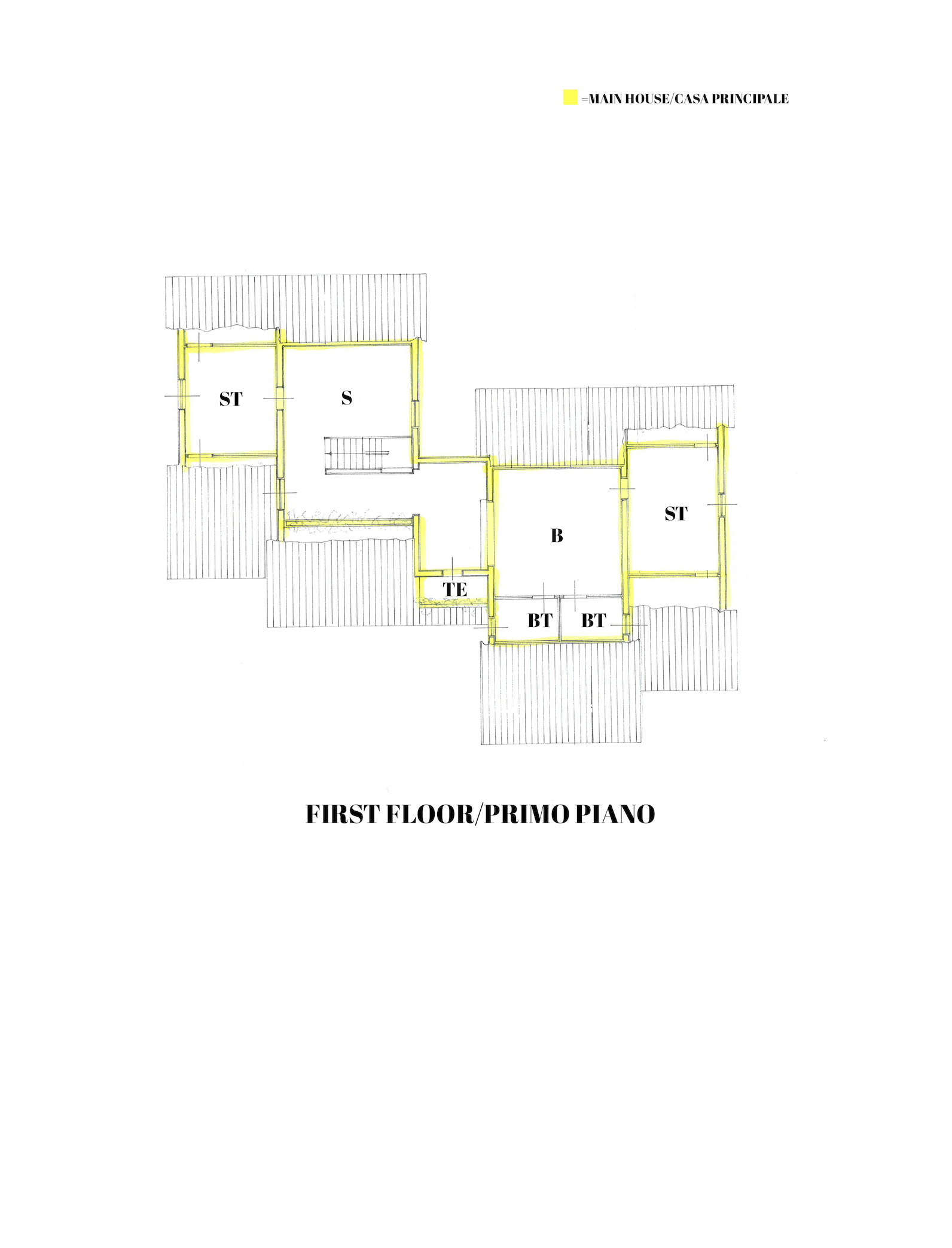 La villa principale, di circa 470 mq, si distingue per l’eleganza degli accessi, con scenografica scala esterna e loggiato, e offre al piano terra un luminoso soggiorno, sala da pranzo, cucina, due spaziose camere matrimoniali (di cui una con guardaroba), bagno e ambienti di servizio;